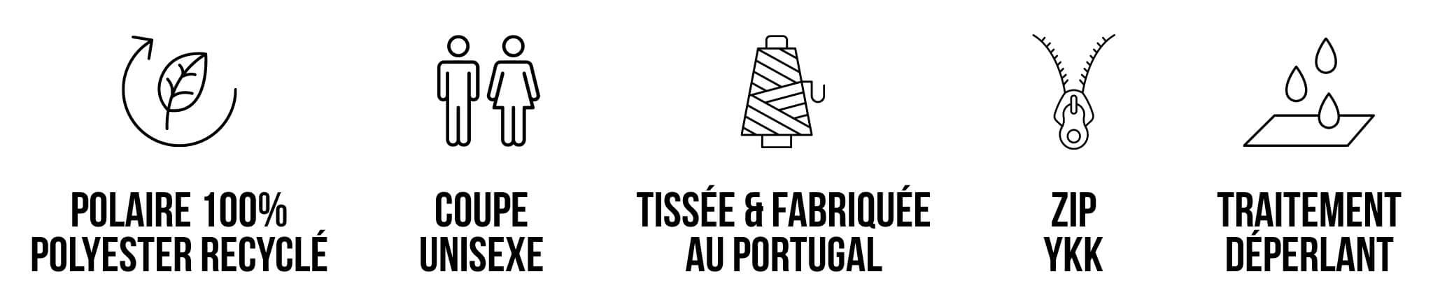 - Matière principale : polaire 100% polyester recyclé, fabriquée au Portugal.