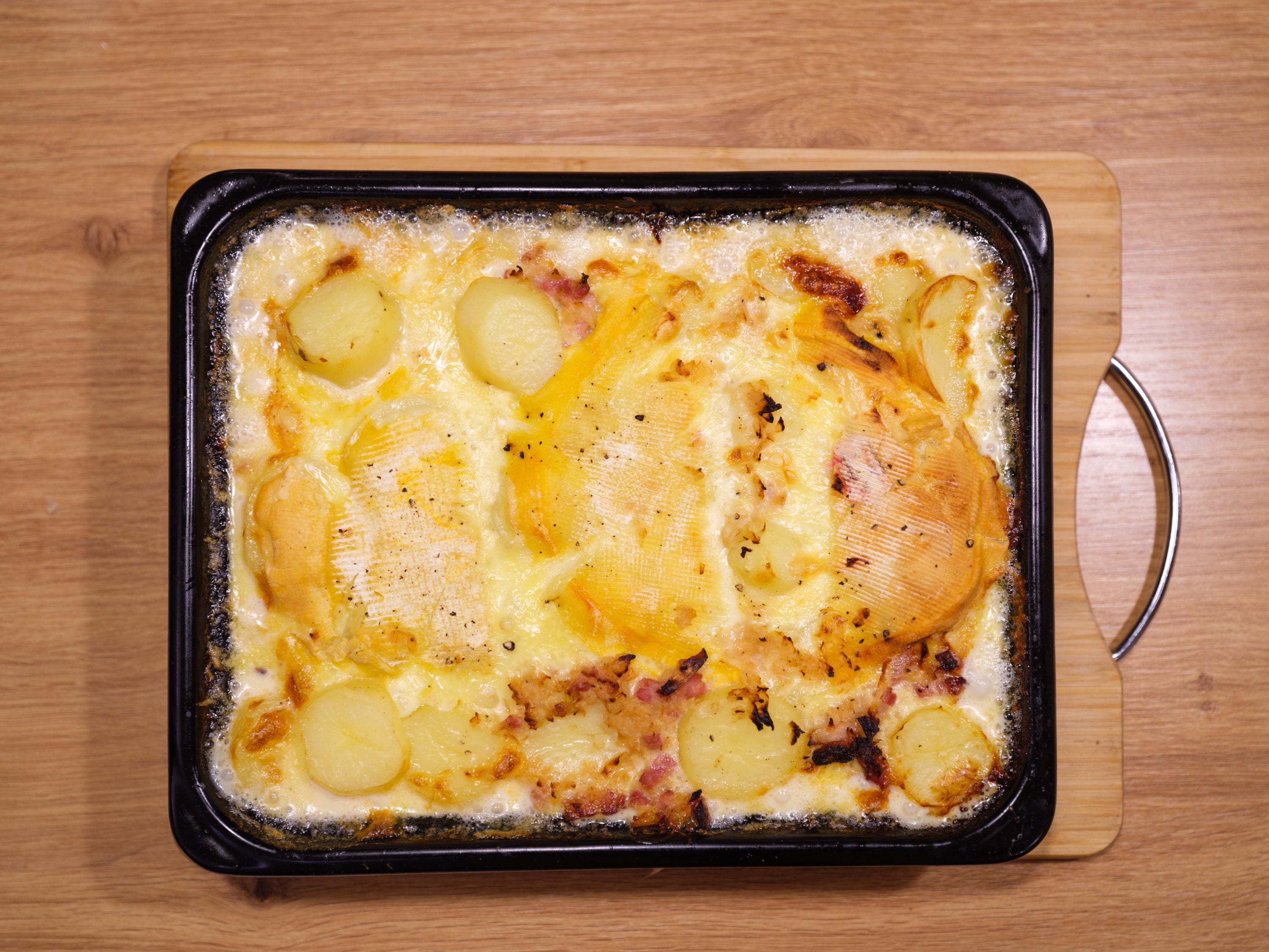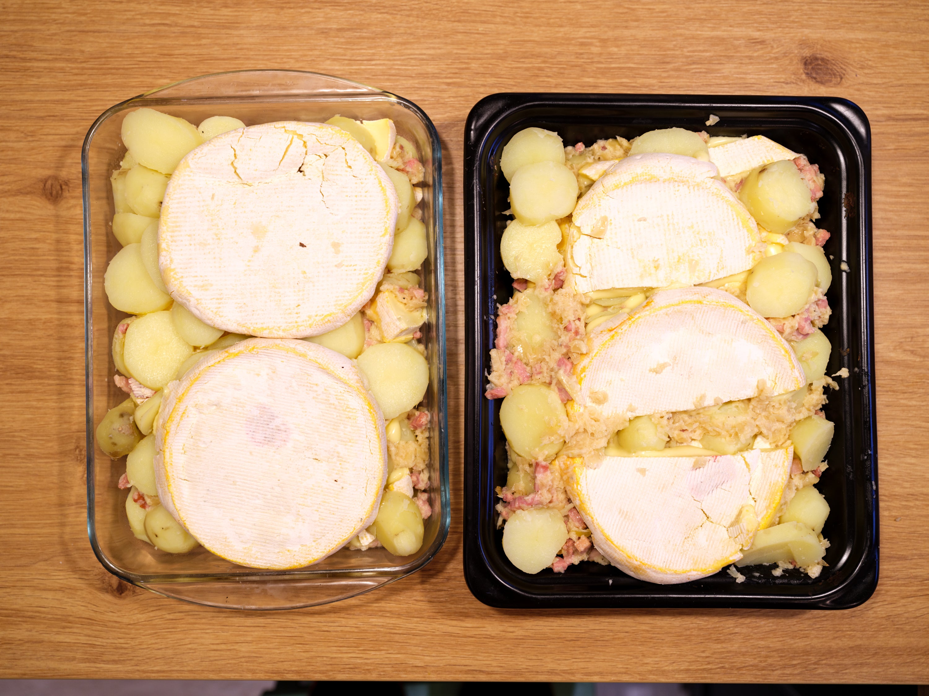 4️⃣ Dans un ou deux plats à gratin suffisamment haut, empiler une couche de patate, le confit de lardons, les lamelles de reblochons, une couche de patates et les demis reblochons (on peut faire plus de couches si le plat est assez haut).