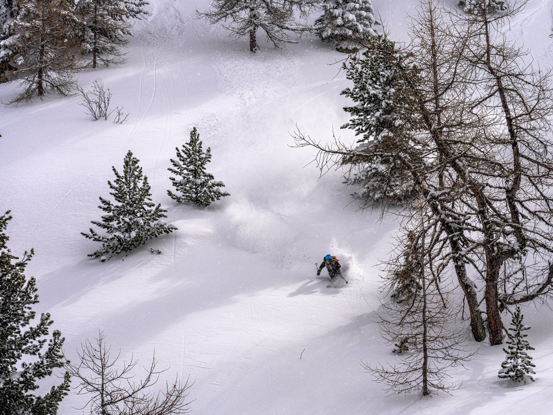 Enak Gavaggio reprend une lampée de poudreuse en ce mois de mars 2021. Il est 13h, la concurrence pour les premières traces semble bien moins féroce que d'habitude dans cet itinéraire classique des Arcs. Allez savoir pourquoi...