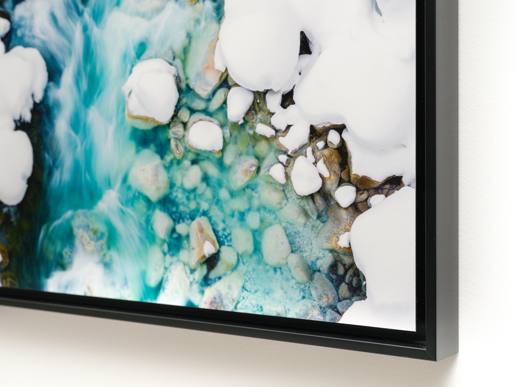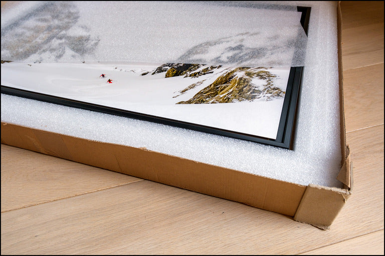 Parfaitement plane et légèrement en retrait, l'oeuvre est parfaitement protégée et l'espace entre la photographie et l'encadrement apporte un effet de légèreté, d'élégance et de profondeur.